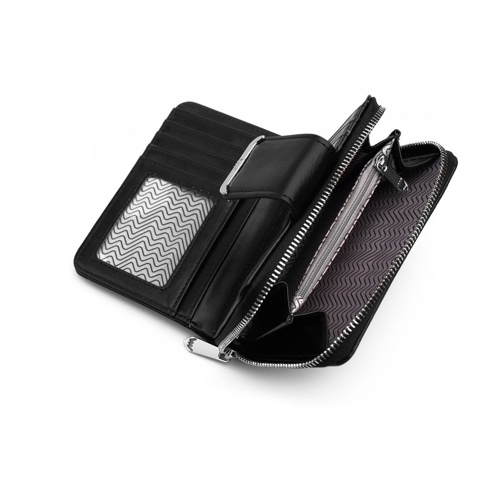 A simple black wallet that has a subtly separated coin pocket from the card and cash compartment. So when you're hunting for change for your cart, you don't have to…