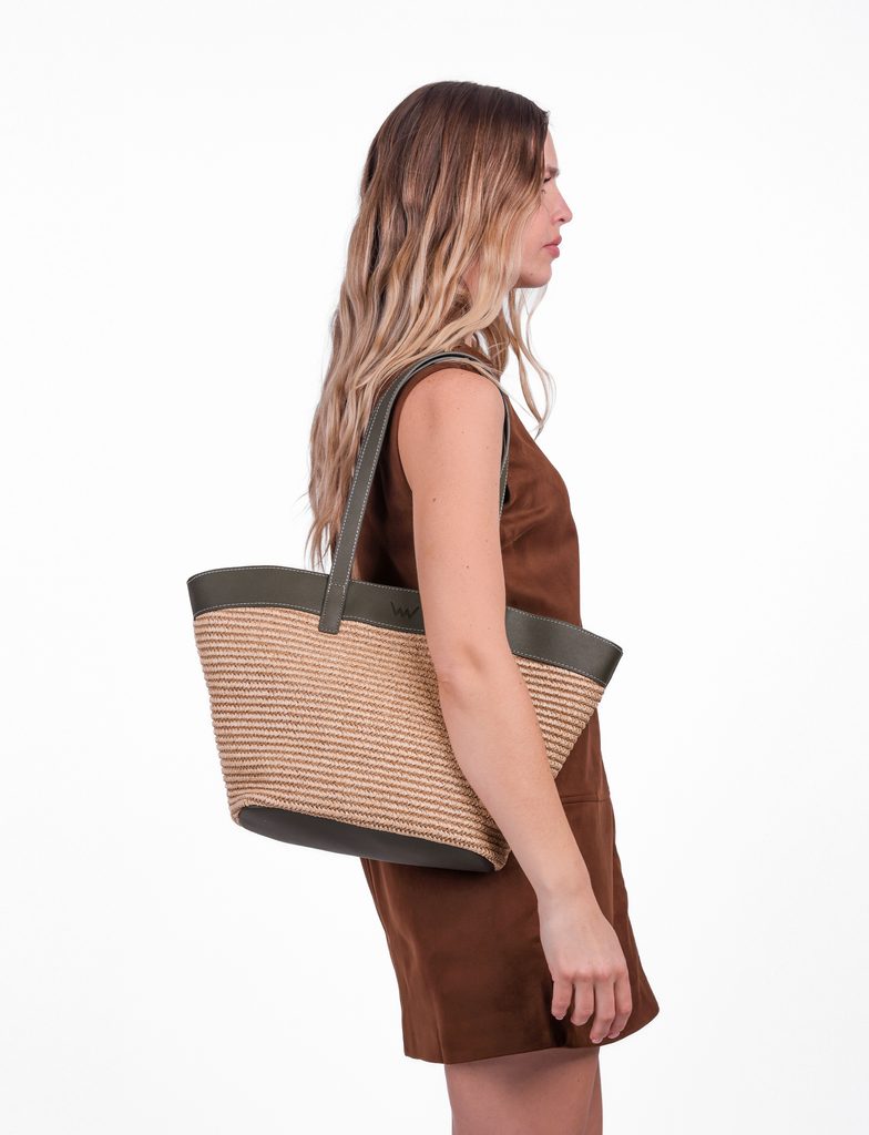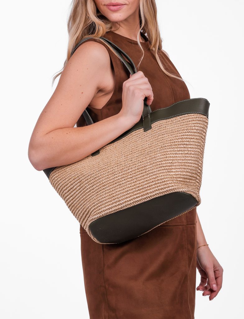 A large bag with the scent of summer. This model combines the lightness of raffia and the elegance of faux leather details. It's a bag for days when you won't settle for…