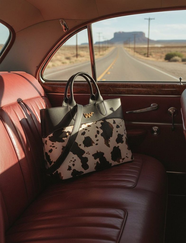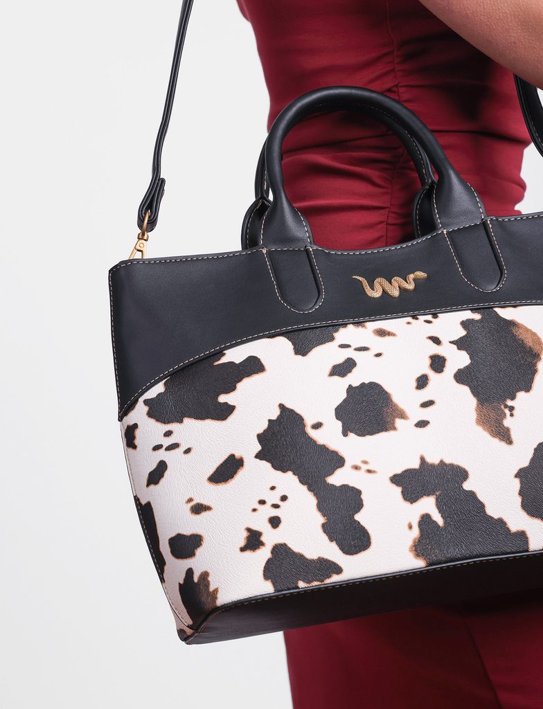 Christel West iconic handbag with cow print pattern