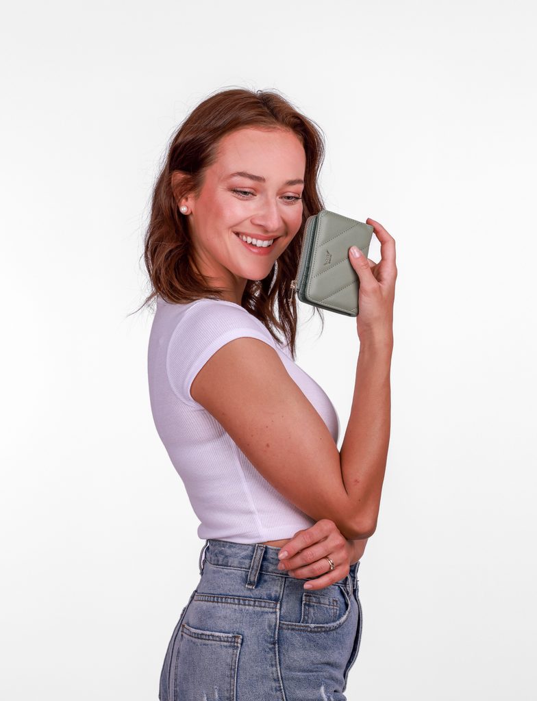 A small purse made from soft material with delicate quilting that fits perfectly in any handbag or hand. Inside you'll find card compartments, a coin pocket and space…